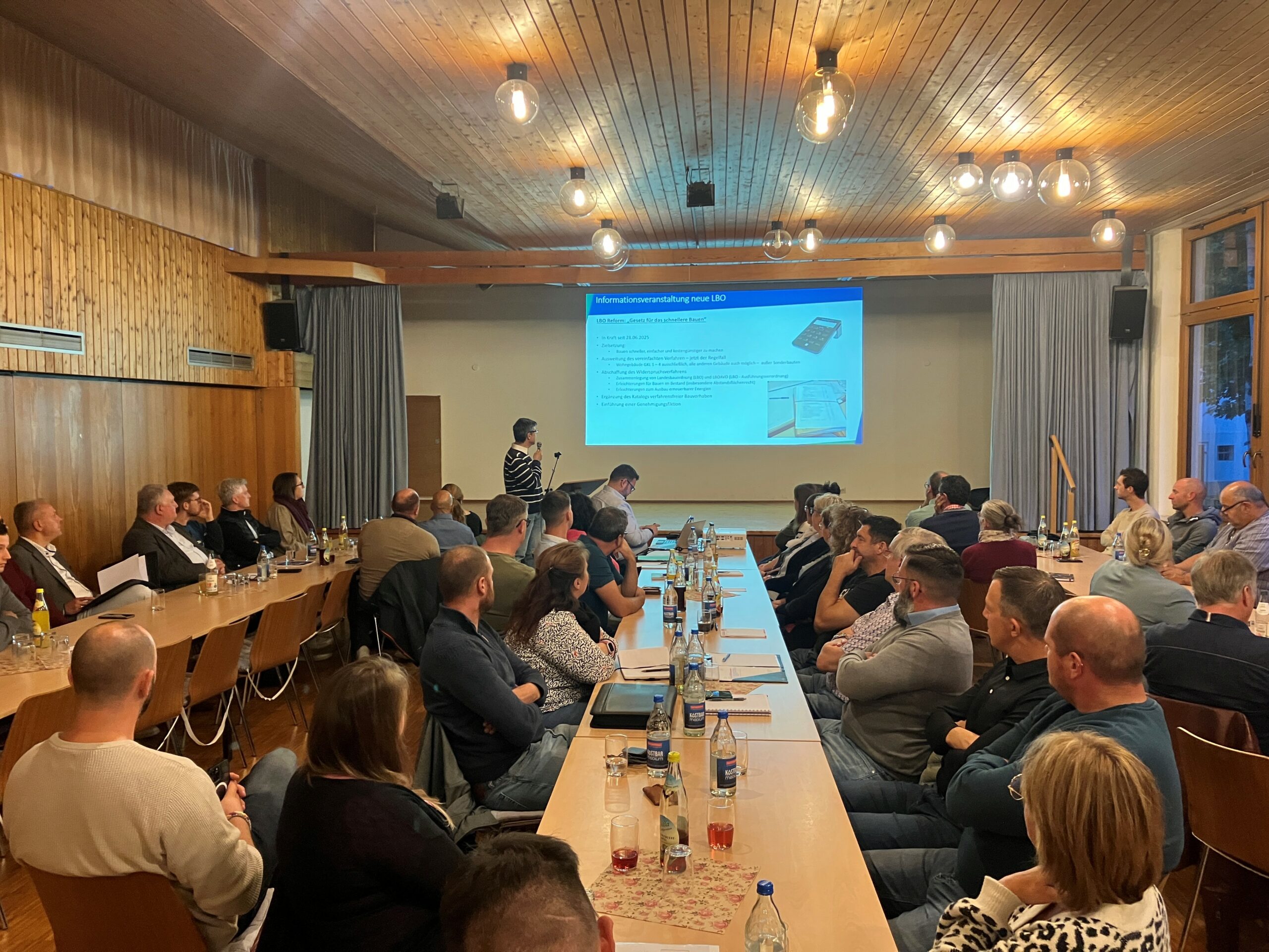 Umfassende gesetzliche Änderungen im Baurecht, insbesondere solche, die sich auf das Zusammenwirken zwischen Gemeinden und Unterer Baurechtsbehörde auswirken, hat die Verwaltung zum Anlass für eine Informationsveranstaltung genommen. Der Einladung des Verbandes hierzu ins Katholische Gemeindezentrum in Kolbingen waren am Dienstag 23.09.2025 die Mitglieder der örtlichen Ratsgremien sowie die Mitarbeiterinnen der Gemeindeverwaltungen der Verbandsgemeinden zahlreich gefolgt.